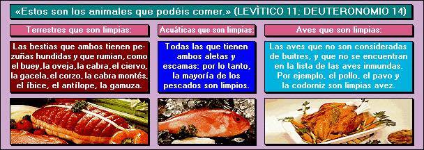 "No comas abominación alguna. He aquí los animales que comeréis: el buey, la oveja y la cabra; el ciervo, la gacela y el corzo; cabra montés, el antílope, el búfalo; la gamuza; todo animal que tenga la pezuña dividida y el pie hendido y rumie; pero no comeréis... EL PUERCO, QUE TIENE LA PEZUÑA HENDIDA, PERO NO RUMIA, ES INMUNDO PARA VOSOTROS. NO COMERÉIS SUS CARNES NI TOCARÉIS SUS CADÁVERES..."